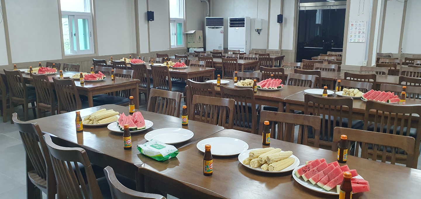 그라고 괴산 중앙교회에서 대학 찰옥수수 수박 그리고 음료수를 제공 하여 함께 하는 시간을 갖고