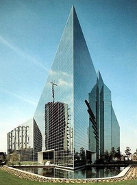 교회 건물 건축에서도, 기존의 교회 건물과는 완전히 다른, 그의 새로운 아이디어가 사람들의 눈을 사로잡았다. 그 당시만 해도 전체 ’유리 벽‘ 건물은 드물던 때였다. 그런데 슐러 목사는 과감하게, 외부는 완전한 유리 벽으로, 내부는 철골을 감추지 않는 식의 ’컨템퍼러리‘ 스타일을 택하였다. 드디어 찬란하게 햇빛에 반사되어 광채를 발하는 ’수정 타워’ ‘크리스틀 커시드럴’ (Crystal Cathedral)이 10에이커의 드넓은 부지 위에 우뚝 솟아올랐다. 이후 이 수정 교회 건물은 L.A. 지역, 관광 코스에 들어가는, 유명한 관광 명소가 되었다.