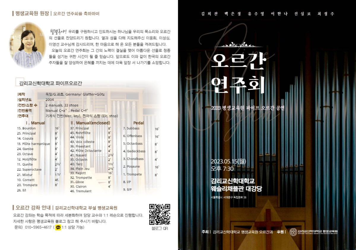 한편, 오는 5월15일 월요일 오후 7시 30분에 오르간 강좌에 수강 중인 재학생들이 파이프 오르간 연주회를 감신대 웨슬리 채플관 대강당에서 가질 예정이다. 연주회는 전 좌석 무료로 많은 분들이 참석하여 오르간의 아름다운 선율과 감동을 함께 하시길 바란다.