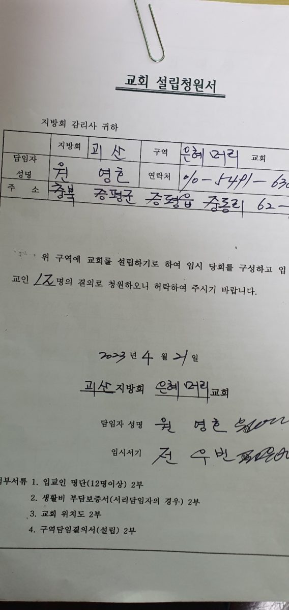 장로님들에 도움을 구해서 지방 실행부회의에서 개척을 허락했다.