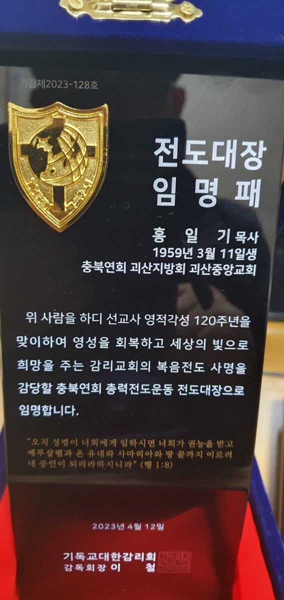 하는 교회를 위해 힘써 왔다. 그리고 영혼을 사랑하고 구원하는 일을 해 왔는데 이번 연회에서 우리 감리교 각 연회 마다 전도 대장을 세워 전도를 더 활발히 하기 위해 각 전도 대장을 세우는데 우리 충북 연회에는 부족한 내가 임명을 받았다.