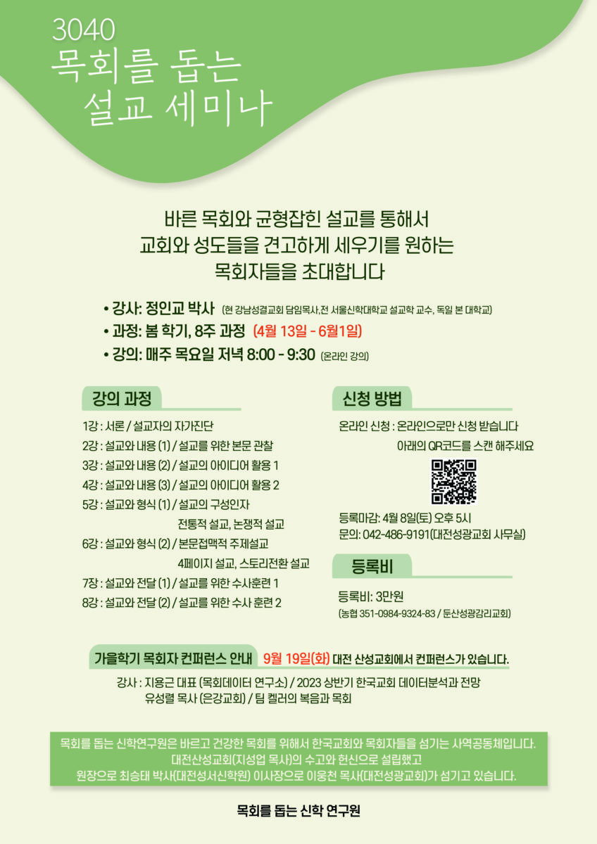 이러한 바른 목회와 균형 잡힌 설교를 통해 성도와, 미래를 변화시키는 교회 공동체를 세워가기 소망하는 목회자들을 위해 “목회를 돕는 신학 연구원”에서 설교 세미나를 준비하였습니다.