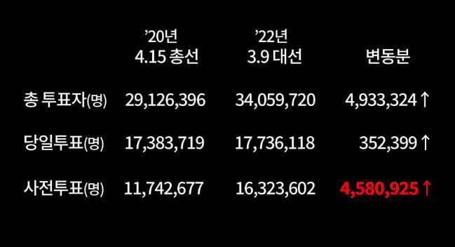사전투표는 20년이 11백만명 22년이 16백50만명 450만명이 늘었습니다