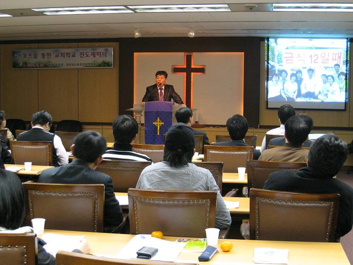 2009년 3월 24일(화) 오후 2시 본부 회의실에서 스포츠를 통한 교회학교 전도세미나가 열렸다. 국내선교부장 태동화목사의 인도로 기도회를 마친 후 교회학교를 통한 교회성장에 대한 정책적 접근에 대한 이야기로 시작하였다. 이어 스포츠선교연합회 사무총장 김성기목사의 스포츠 활동을 통한 전도방법 강의가 이어졌다. 마지막으로 강릉남지방 강남교회 김영민감리사의 어린이 축구를 통한 교회학교 부흥에 대한 사례발표와 연구 논문 중심의 강의가 있었다. 이날 세미나의 참석자들은 큰 도전을 받았으며 질문과 토론의 시간도 가졌다.