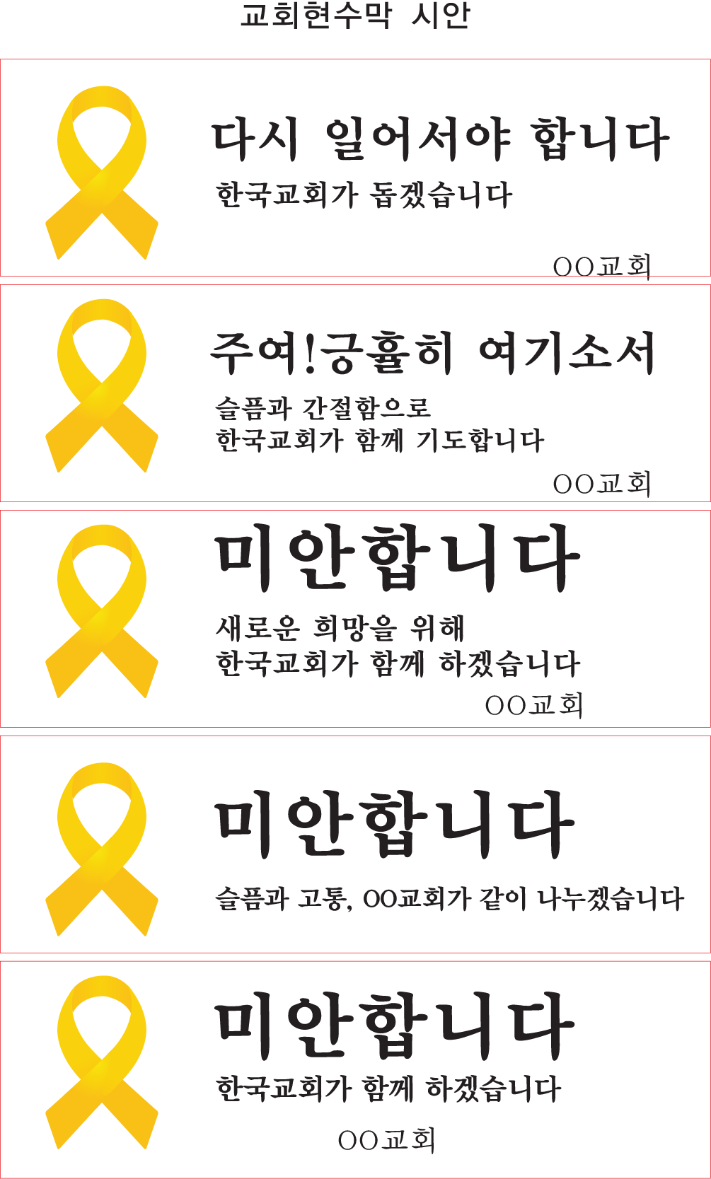 세월호 관련 금식기도회 및 교회 현수막 샘플 첨부 1. 금식기도회 첨부 2. 교회현수막 http://kmc.or.kr/data/sewel.banner.zip 인쇄용다운 첨부파일 ban01.bmp ban02.bmp